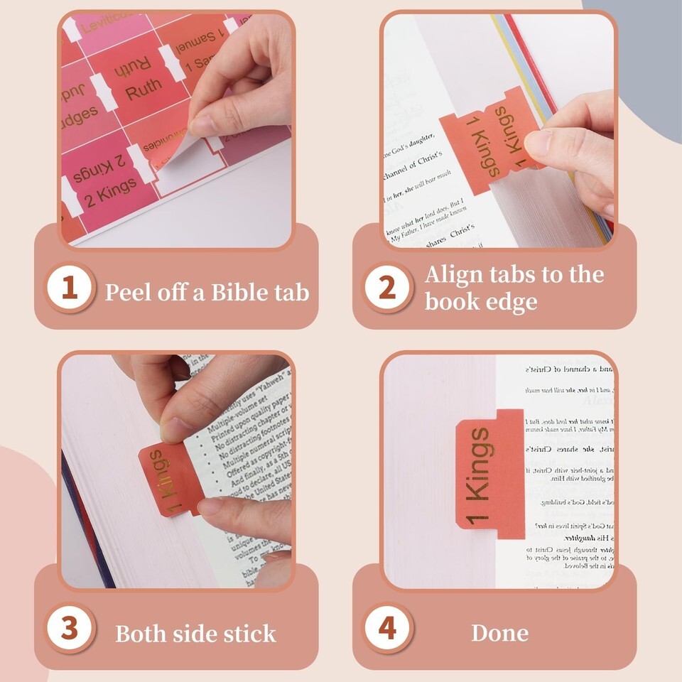 Easy to ApplyThe self-adhesive bible tabs are perfectly designed for folding, simply align them to the different chapters of the new Bible, and the stickers are pre-scored in the middle for easy folding.
