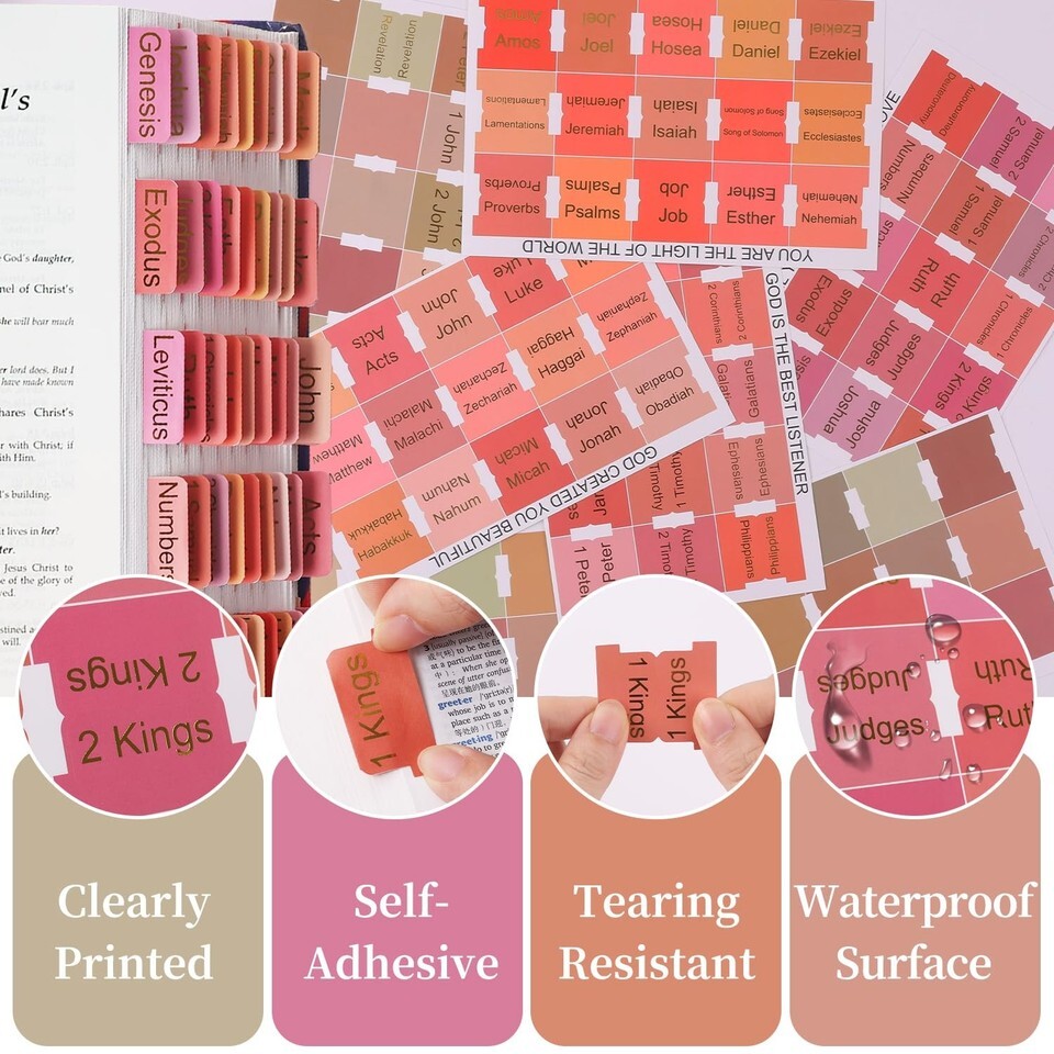 Quality Material for ReusableThese bible tabs for women and men are made of quality waterproof material, tear-proof, and durable. If you accidentally attached one to the wrong page, you could carefully remove it without damage to the page and reattach it to the correct page.