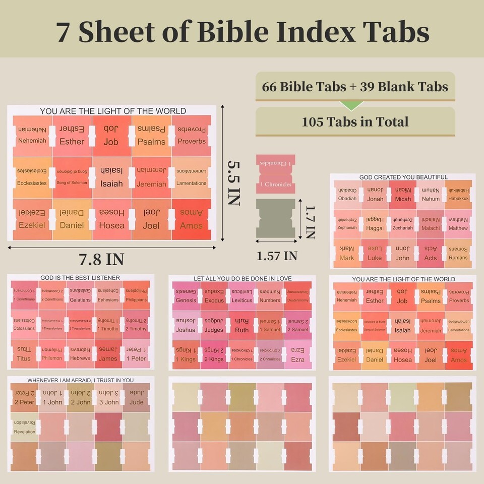 66 Bible Book Tabs+39 Neutral Tabs Set of 105PCS bible tabs featuring an assortment of 39 Old Testament books, 27 New Testament books, and 39 blank tabs total of 7 sheets. Pre-printed tabs could meet your bible study needs, and the blank tabs can be personalized or used to index the books in the Catholic Bible.