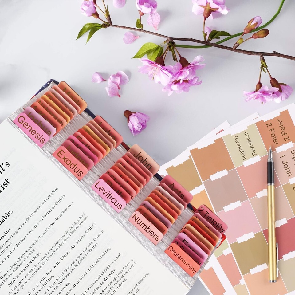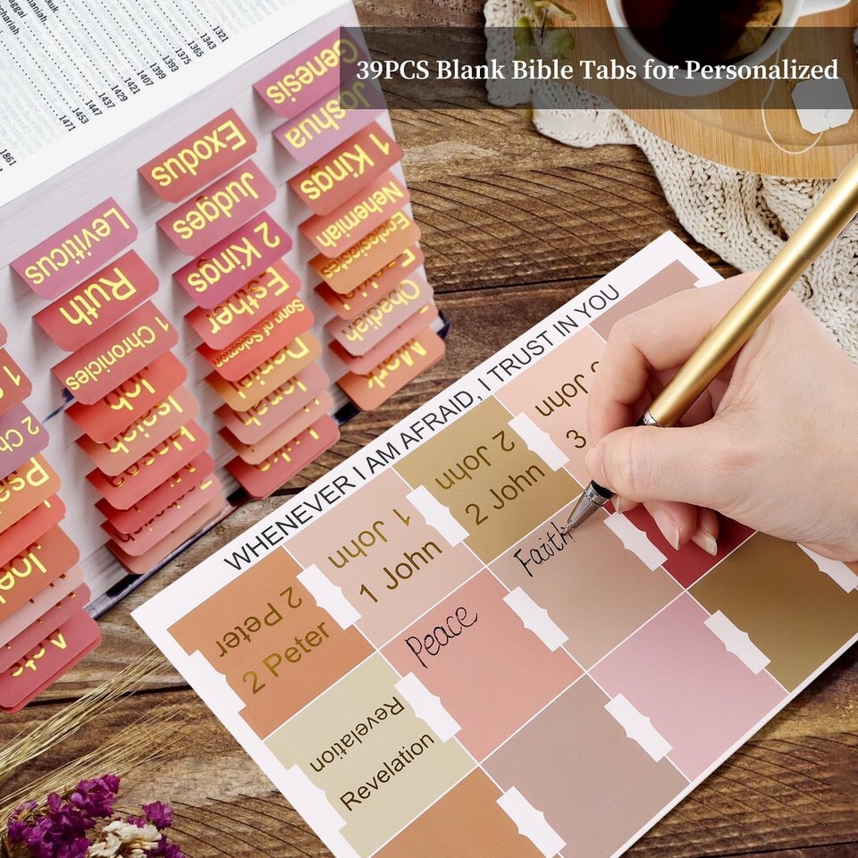 Make the Bible Study Much EasierThese beautiful bible tabs could make your bible study more organized and inspiring. Large printed hot stamping font unlike other small version Bible stickers, you can see the Bible table of contents without any magnifying glass or glasses. Also, the golden font makes the Bible tabs more upscale.