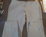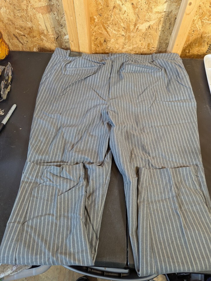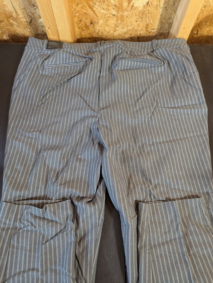 Lane Bryant size 20 striped rayon dress pants with an elastic waist and flat front. The pants feature a grey and white striped pattern, suitable for formal, business, or party/cocktail occasions. They have a 41-inch waist size, 26-inch inseam, and are machine washable. Made of comfortable knit fabric with pockets, these straight-leg pants are easy to care for and versatile for various seasons.