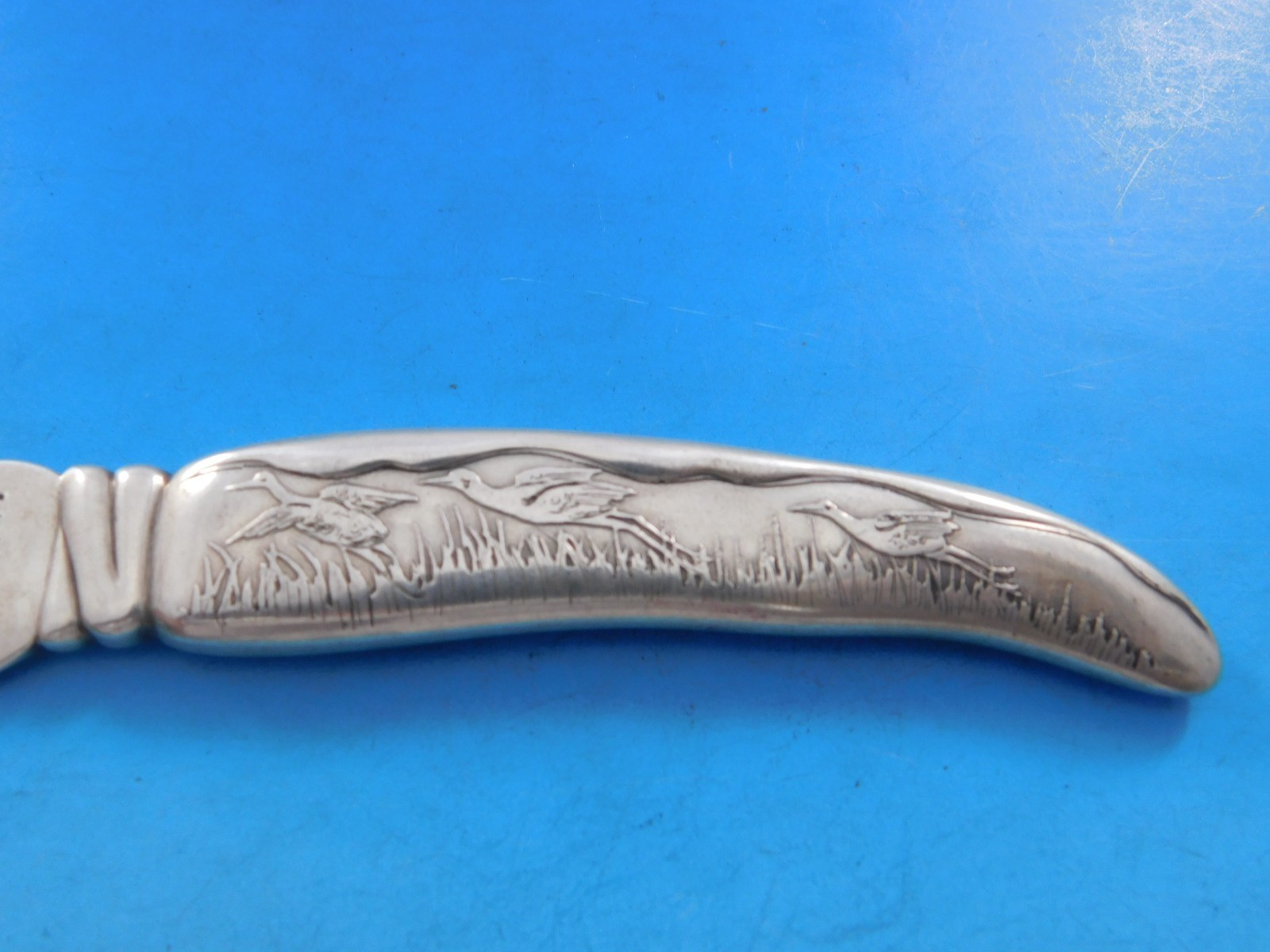 Sterling silver hollow handle, all-sterling, Fish Knife with engraved blade with three birds taking off above grass 7 7/8" in the pattern Lap Over Edge Acid Etched By Tiffany Co. It is not monogrammed and is in excellent condition.