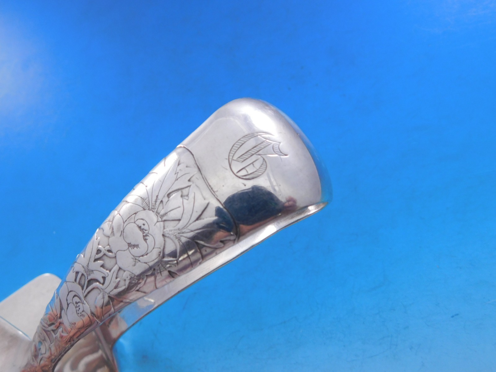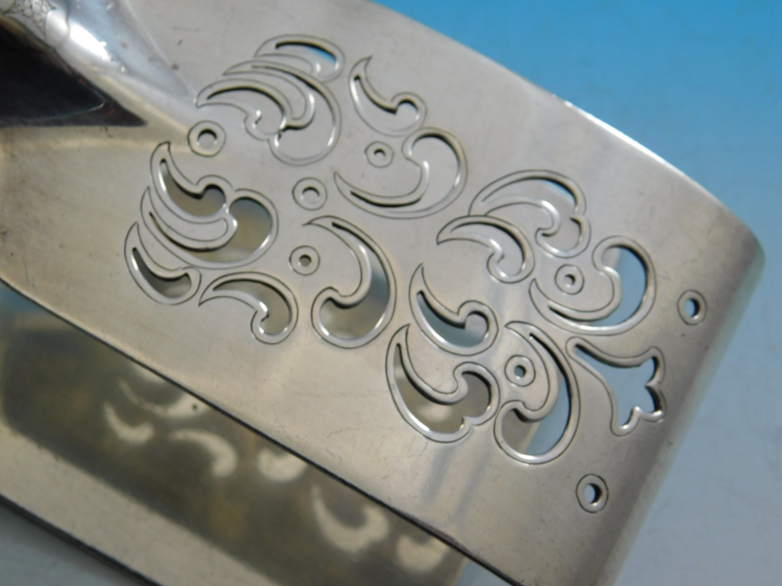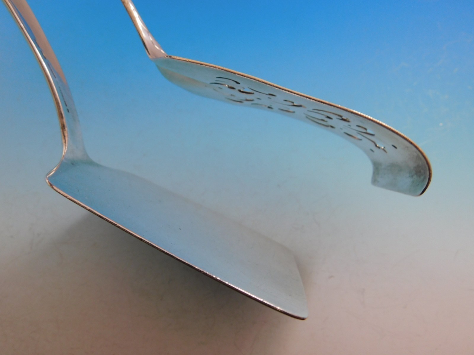 Rare sterling silver Asparagus Serving Tong measuring 7 1/4" in the pattern Lap Over Edge Acid Etched by Tiffany. This multi-motif pattern is circa 1880 and features an array of designs from animals to fruits and vegetable to flowers. This piece features a peony motif on the handle and stunning brite-cut detail and piercings on the serving area. This piece is featured on page 99 in the "Tiffany Silver Flatware 1845-1905: When Dining Was an Art" by William P Hood Jr with Rosalyn Berlin and Edward Wawrynek. It is monogrammed (see photo) an in excellent condition.