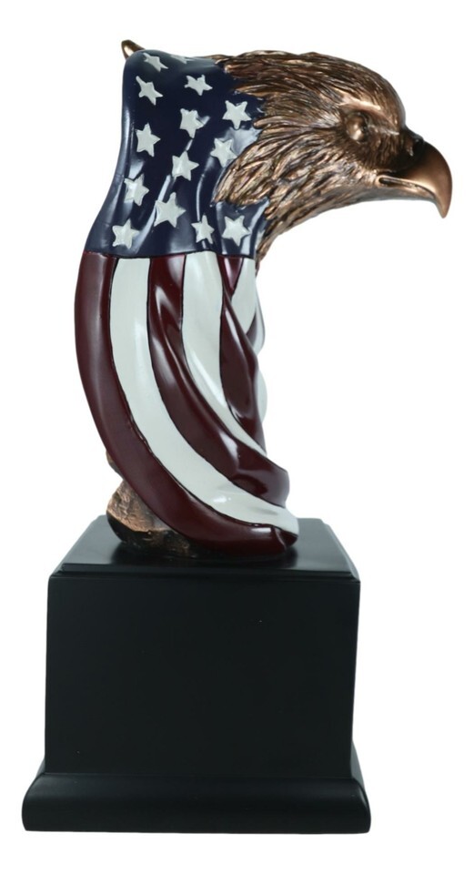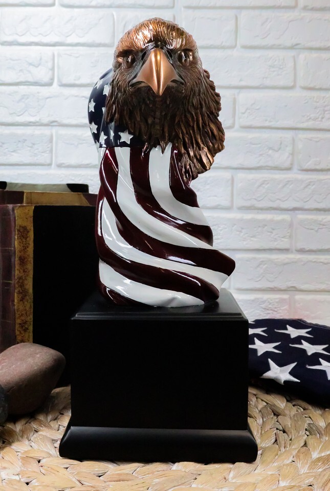 ? This Patriotic Bald Eagle On USA Flag Statue is made of the highest quality resin, undergoing the process of bronze electroplating giving it a uniform shine on the inside as well as the surface of the figurine. To add sculptural aesthetics and display worthiness, we add accent faux black wooden base to the sculpture.