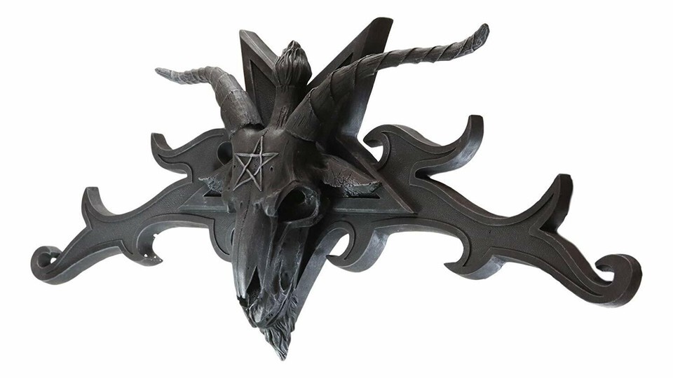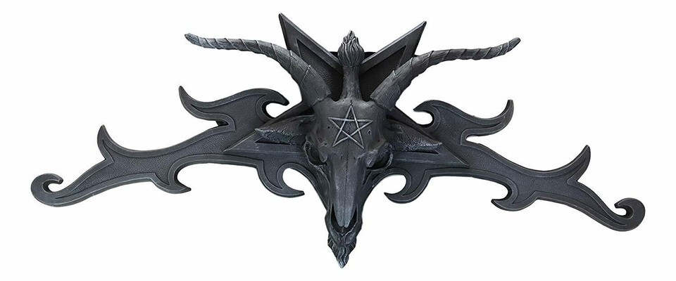 ? Bring a dash of occult mythology to your home decor with the Baphomet Wall Decor, the perfect addition to any alternatively styled abode. Multi purpose hanging sculpture goes great as an overdoor pediment, wall plaque centerpiece and more! This highly detailed Baphomet Sculpture features the head of the Sabbatic Goat, with a distinct pentagram on his temple as well as in his background. Shooting off from his left and right ears are extensions of hell fire.