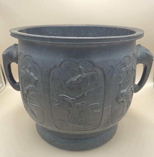 It is made of bronze and features detailed relief carvings of birds and trees. Top diameter is around 10?, 9? high. Please review all pictures as part of the description.