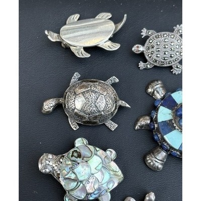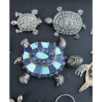 OFFERED FOR SALE TURTLE JEWELRY COLLECTION FROM THE ESTATE, COMPRISING OF BROOCHES,BRACELETS,EARRINGS, RING,PENDANTS.THE LARGEST PENDANT WITH TURQUOISE AND LAPIS LASULY GEMSTONES MEASURES 2 1/2'' x 1 3/4'' x 3/4'' AND WEIGHS 36.3 GRAMS.ONE PENDANT SET WITH LEOPARD JASPER, ONE WITH AMBER,ONE WITH CARVED TIGER'S EYE SCARAB,AND ONE WITH ABALONE INLAY.GROSS WEIGHT IS 150.0 GRAMSTHE TURTLE WITH SCARAB IS GOLD FILLED AND IT'S NOT STERLING SILVER. ONE PENDANT HAS MOVABLE FEET AND HEAD.THE AMBER BROOCH IS UNMARKED, TESTED FOR SOLID 925 STERLING SILVER.ALL THE ITEMS ARE IN GREAT CONDITION,FREE OF ANY KIND OF DAMAGE OR REPAIRS.