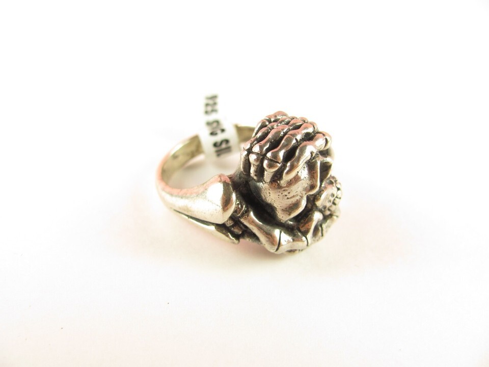 - LARGE HEAVY 925 SILVER stamped BIKER RING SKULL IN HANDS Size 9.5