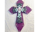 Statement cross in deep purple with glittery finish, rhinestone stud accents on each point, and a layered mint/pink fleur-de-lis centerpiece over marbled black panels. Lightweight and ready to hang.