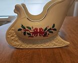 The Large Lenox Holiday Sleigh Centerpiece is a festive and decorative piece perfect for holiday celebrations. Made in the USA, this ceramic and porcelain centerpiece features a holly design with a red bow and gold trim, adding a touch of elegance to any Christmas table setting. With its multicolor design and historical manufacture between 1990-1999, this collectible item is a charming addition to any holiday decor collection.