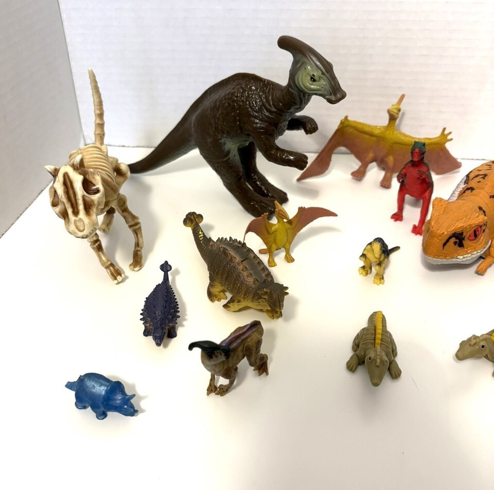 Large Mixed Lot Of 14 Dinosaurs Small, Medium, Large, the sizes range from 1"-6" tall. The battery operated one is a Jurassic World Speed Dino and is missing the back cover and does not work without the cover.
