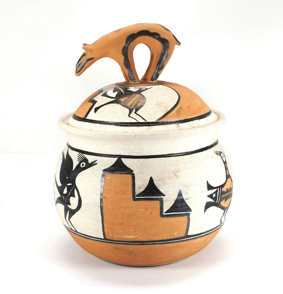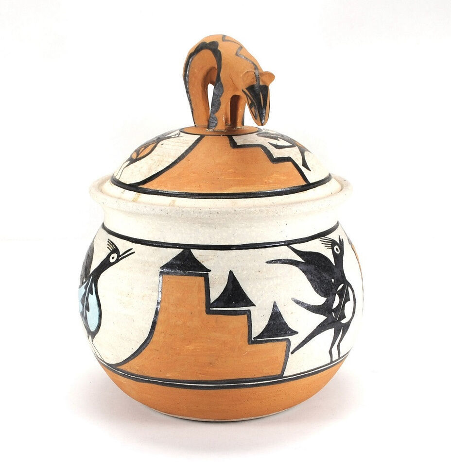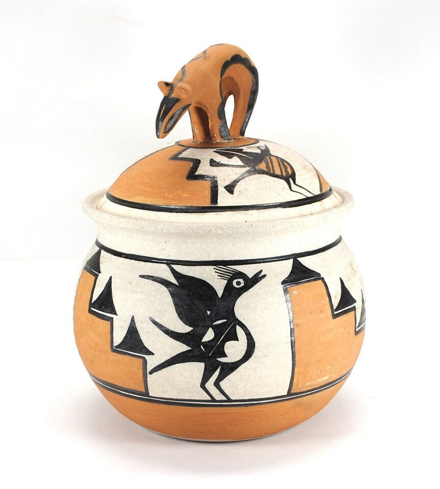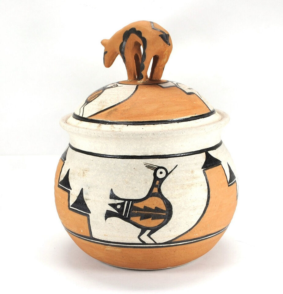 - Large Native American Zia Polychrome Pottery Jar Pot Three Birds Bear Lid Signed
