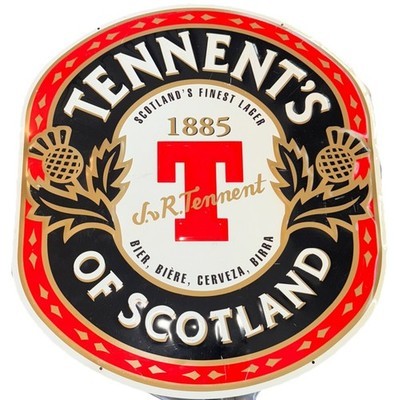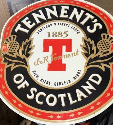 - Large Tennent’s of Scotland Lager metal embossed sign 18"H x 16"W Alum Beer Sign