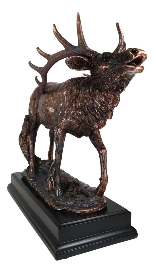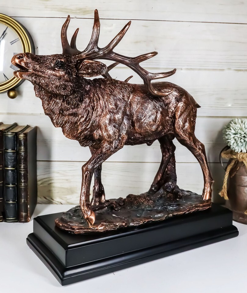 ? This Emperor Elk Deer Statue is made of the highest quality resin, undergoing the process of bronze electroplating giving it a uniform shine on the inside as well as the surface of the figurine. To add sculptural aesthetics and display worthiness, we add accent black plastic bases to the sculpture.