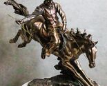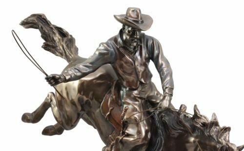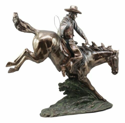 - Large Western Cowboy With Lasso On Bucking Horse Statue 19"L Faux Bronze Resin