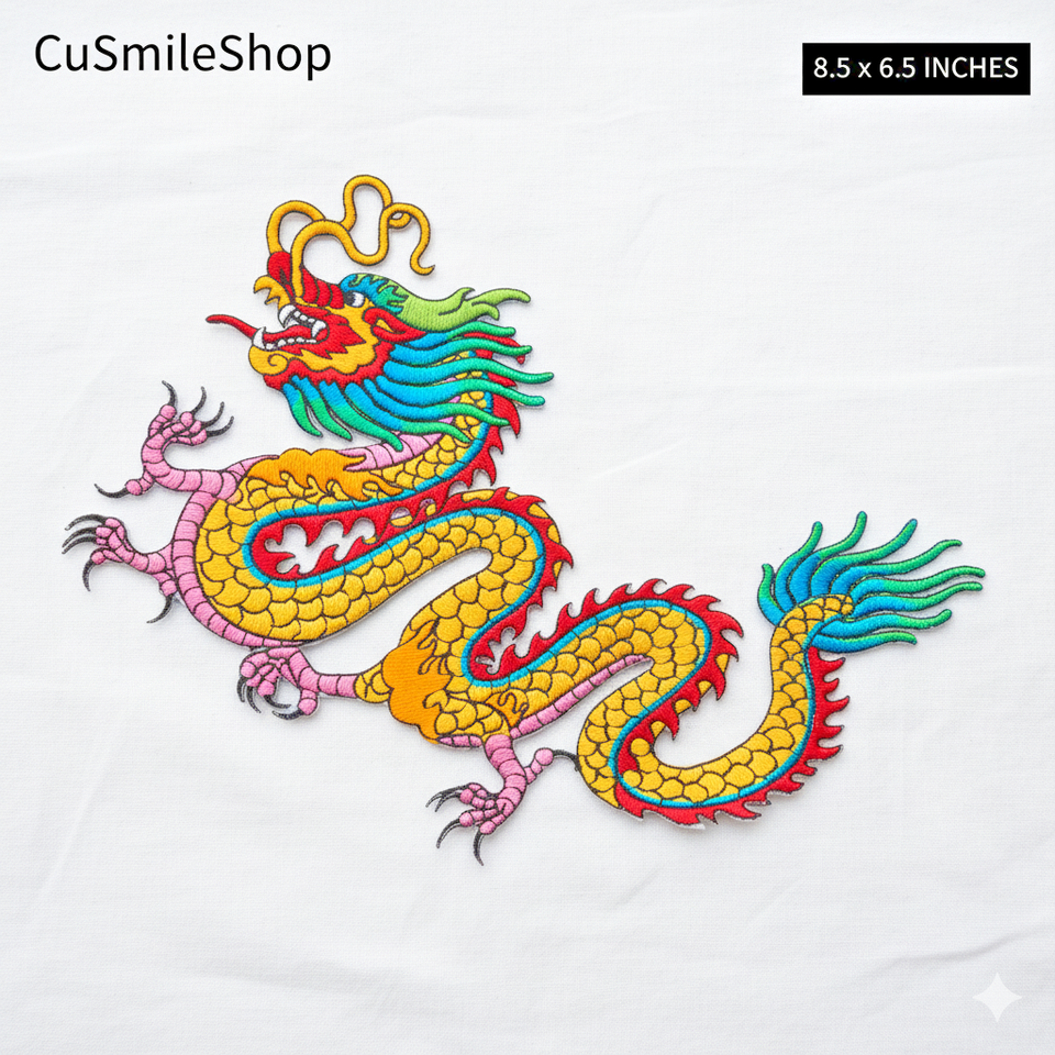Oriental Dragon Iron-On Patch – Embroidered Thai Craft Applique for Jackets, Denim Biker Vests