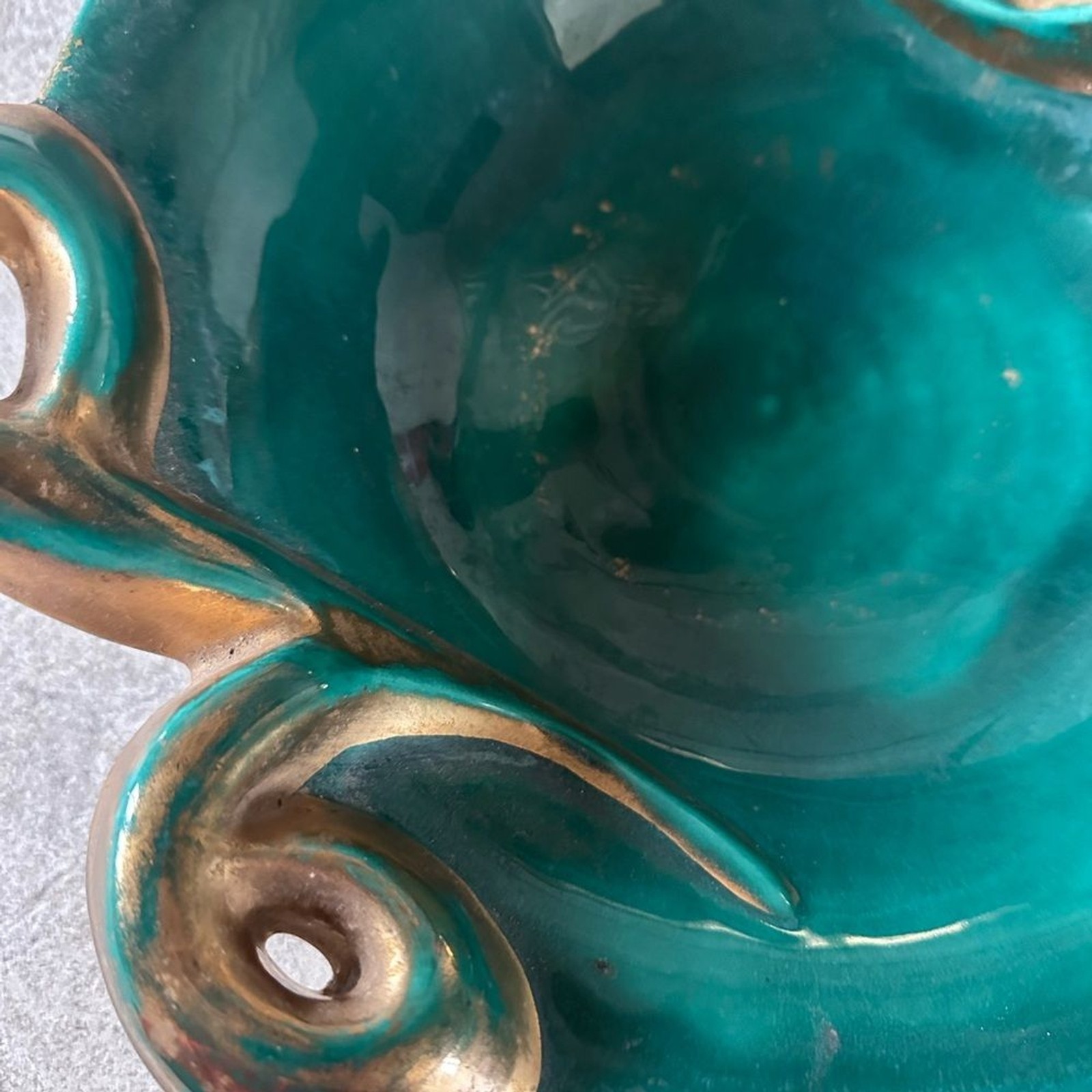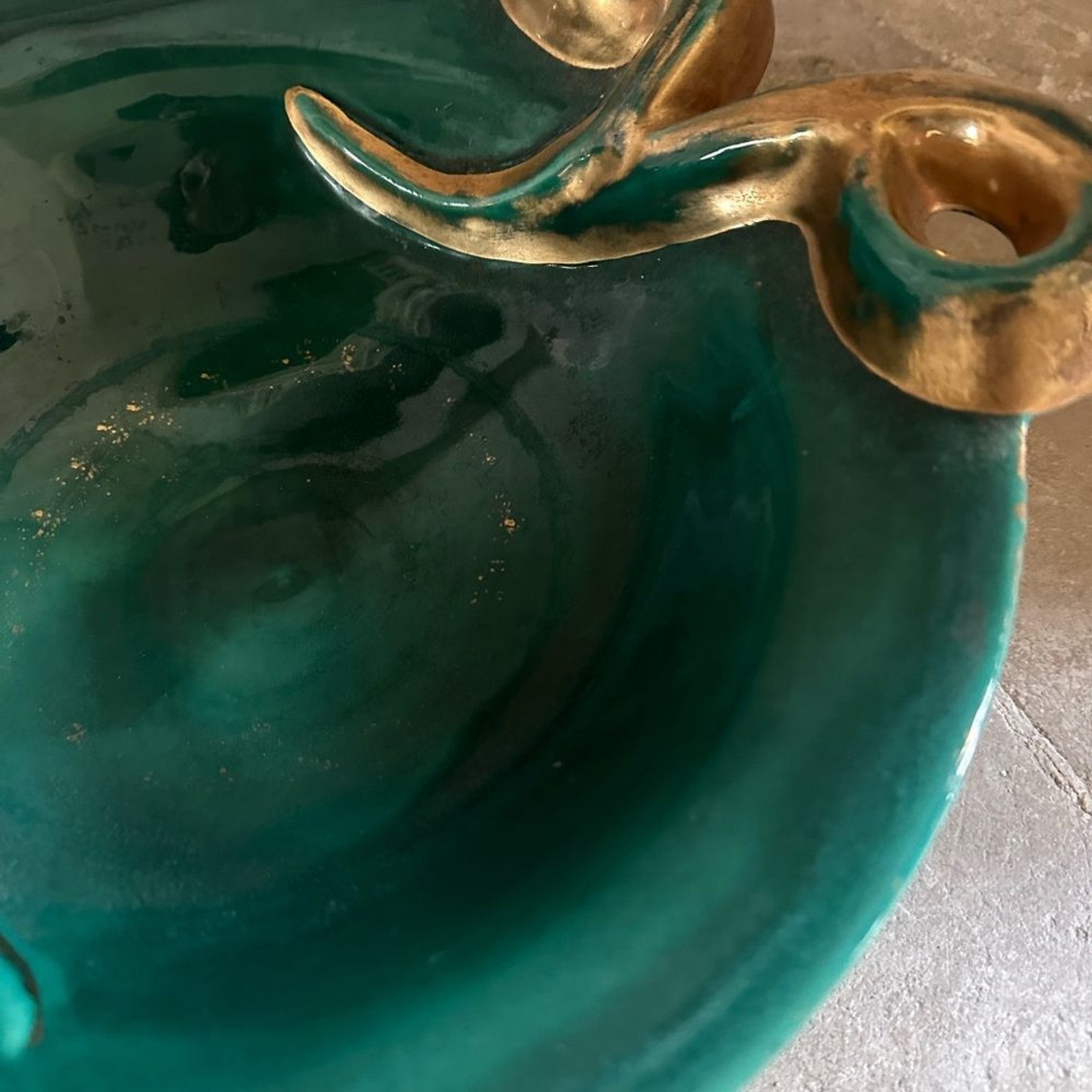 - Large vintage French ceramic fruit dish bowl signed green gold STUNNING
