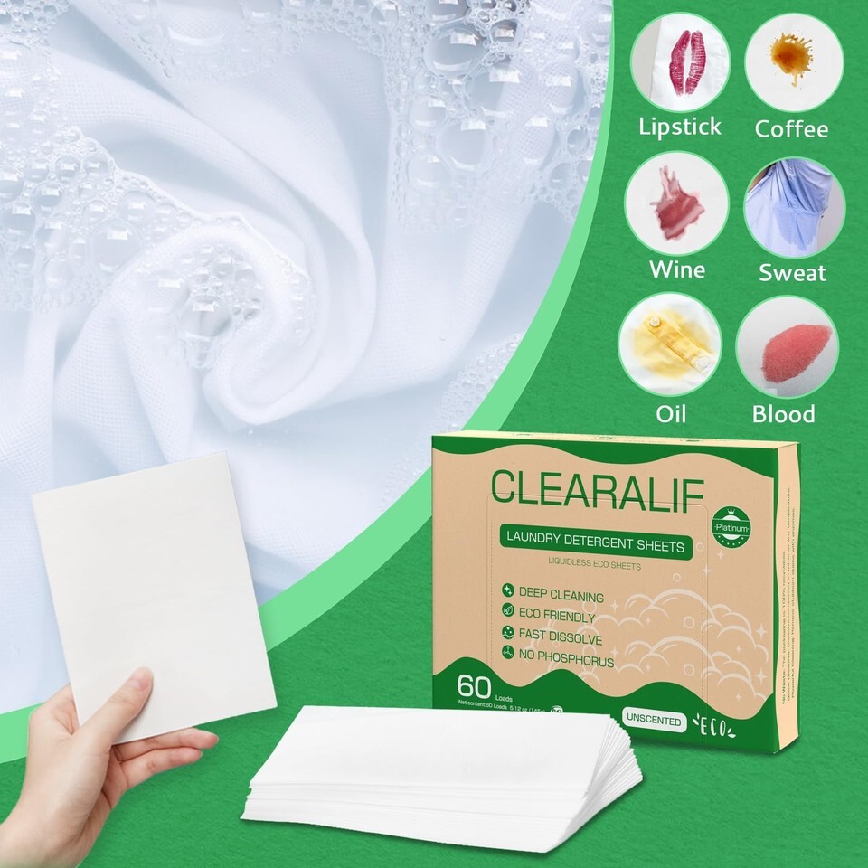 Save Space Powerful Clean: Those big plastic jugs are bulky! You can fit many laundry sheets in the same space as one plastic jug. and this laundry sheets consist of surfactants and enzymes that help remove various stains like oil, red wine, blood, and coffee from your clothes.