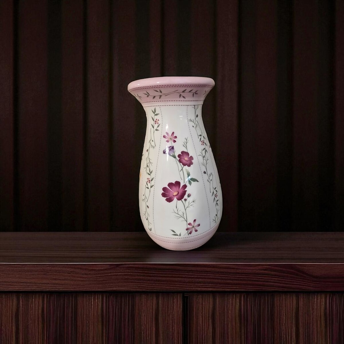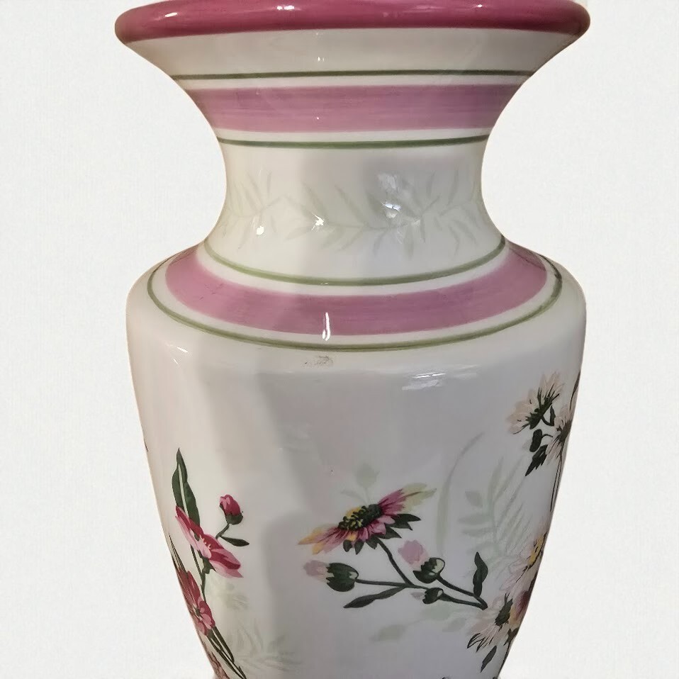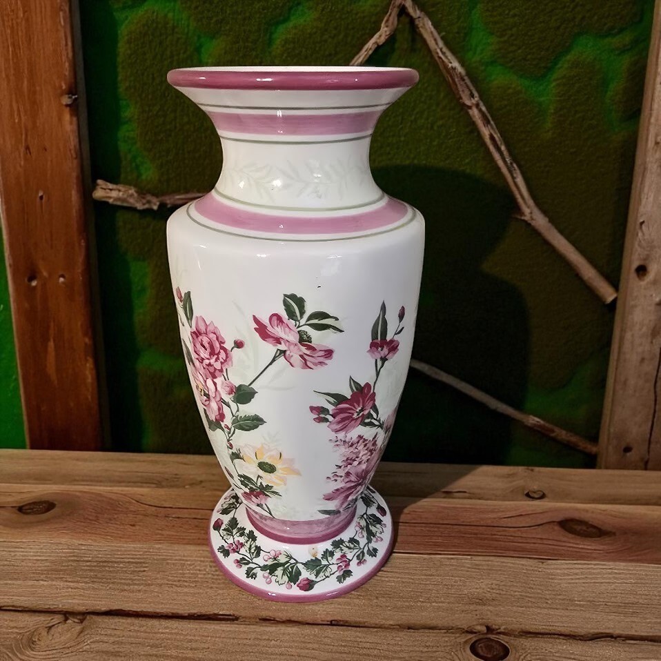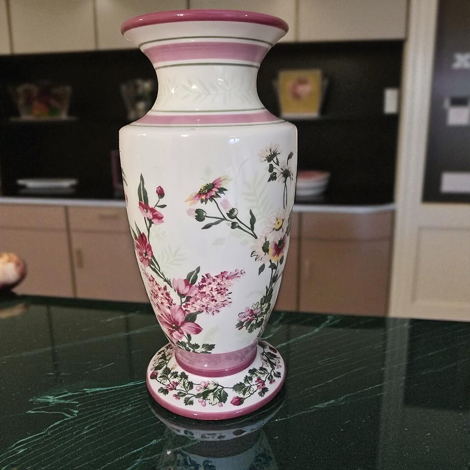 Soft English-garden blooms wrap these two coordinating ceramic vases?one classic pedestal urn, one gently waisted trumpet?finished in Laura Ashley?s signature blush-pink bands. Perfect for fresh bouquets, dried florals, or as stand-alone accent pieces that bring a touch of cottage charm to any room.
