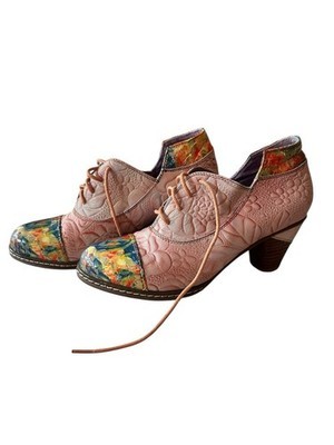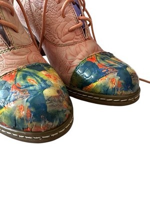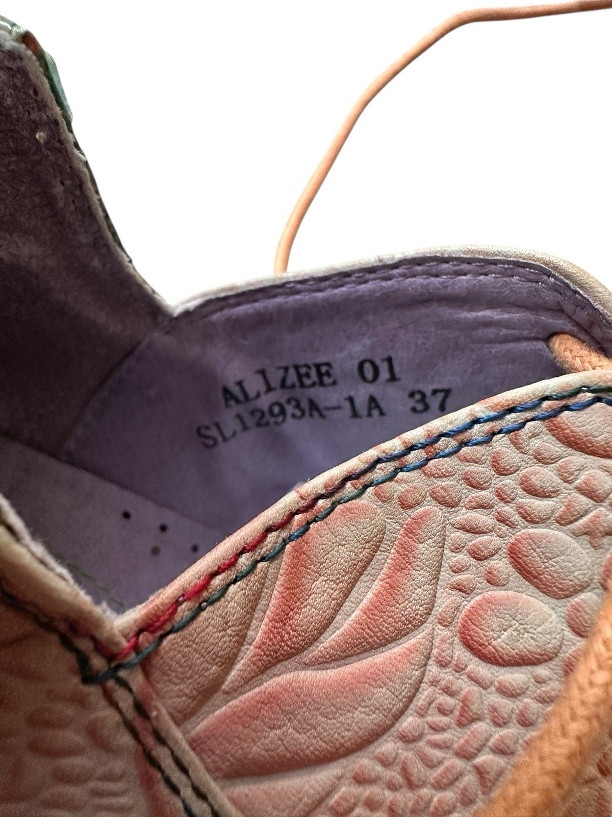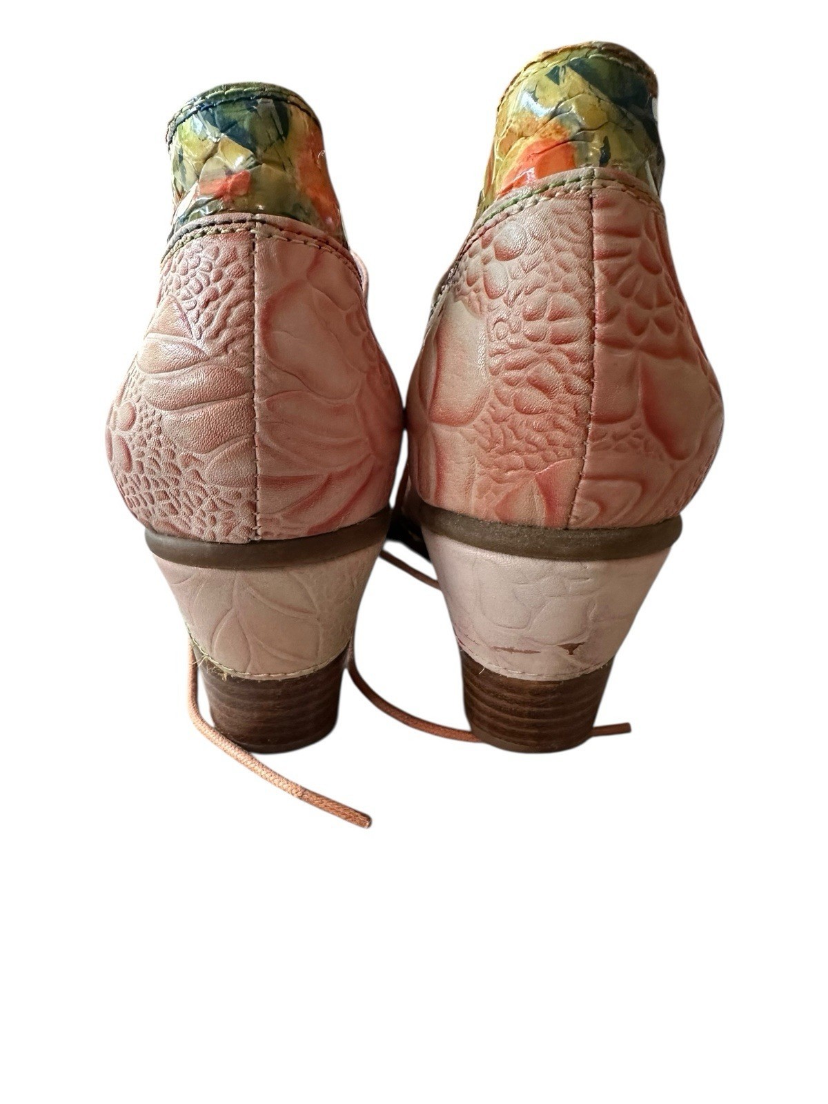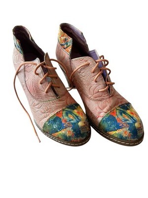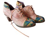 37 FR women?s shoes corresponds to roughly 6.5-7 women?s US. Embossed floral design. Lace up, chunky heel. Some scuff to one of the heels. Very good condition overall.