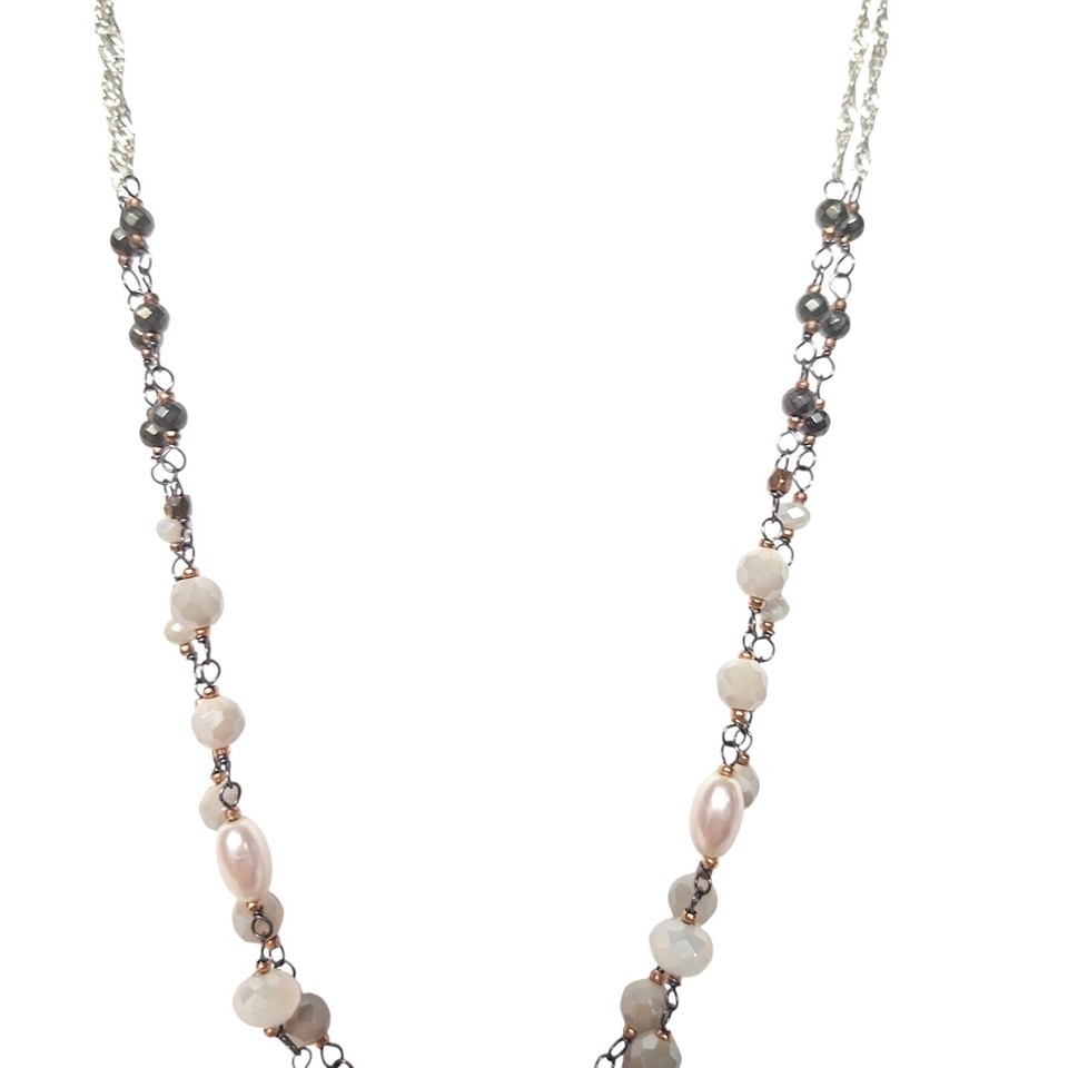 This layered necklace features an elegant combination of pearls and metallic beads, accentuated with a teardrop pendant. The adjustable clasp ensures a secure fit, while the multi-tone design adds sophistication to your attire. Ideal for adding a unique touch to formal or casual outfits.