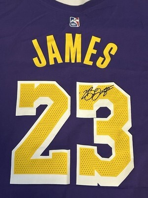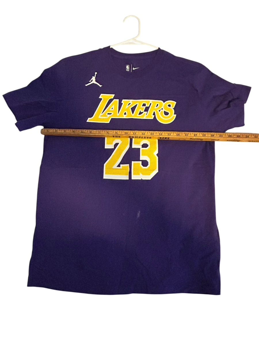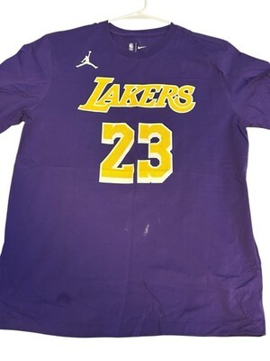 The LeBron James Nike Tee #23 in size L features the iconic L.A. Lakers design with an embroidered auto signature, making it a must-have for any fan of the basketball legend. This officially licensed shirt by Nike showcases LeBron's association with the Los Angeles Lakers in the NBA, with a purple color scheme that pays homage to the team's iconic jerseys. Ideal for unisex adults, this shirt is a stylish and comfortable way to show support for LeBron James and the Lakers. This is an embroidered Lebron Autograph signature. I think one of the mall stores do this for about $30 more to the shirt.