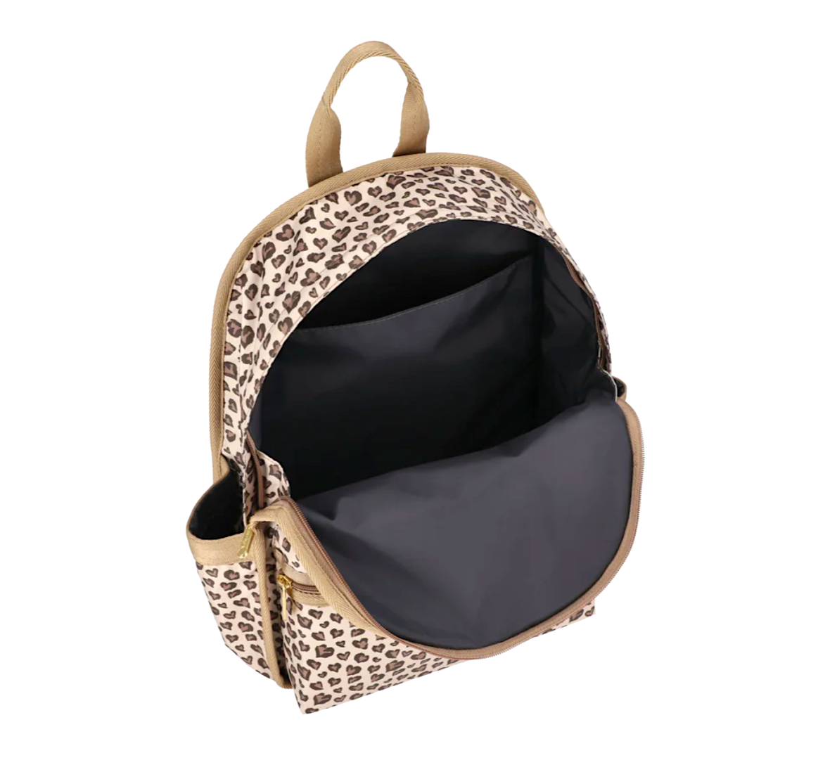 LeSportsac Latte Heart Leopard Brown Small Route Backpack, Style 3746/Color HC09, Modern Abstract Interpretative Heart Leopard Design in Cocoa, Palomino Mocha. Playful whimsical modern heart leopard interpretative design features go-with-everything hues of cocoa, palomino mocha. Neutral palomino beige straps/trim, sleek black interior lining and features a subtle pearlized sheen elegant gold tone zip pulls. Favorite lightweight ripstop nylon in new environmentally conscious recycled material. Each backpack features a different pattern layout, making each backpack unique, limited edition. The Small Route Backpack is a smaller sized reinvention of the ultra-popular Basic Backpack features many pockets/compartments. Zip main closure with dual zipper pulls, exterior front zip closure pocket, two exterior side open top pockets, interior back wall open pocket, 1? wide pinched top handle (handle drop 3?, handle length 10.43?, handle width 1? wide adjustable shoulder straps (max length: 28?). Size: 14?H 10.8?W 3.9?D. 60 day returns. Free domestic shipping. International orders shipped through?s International Shipping Program.