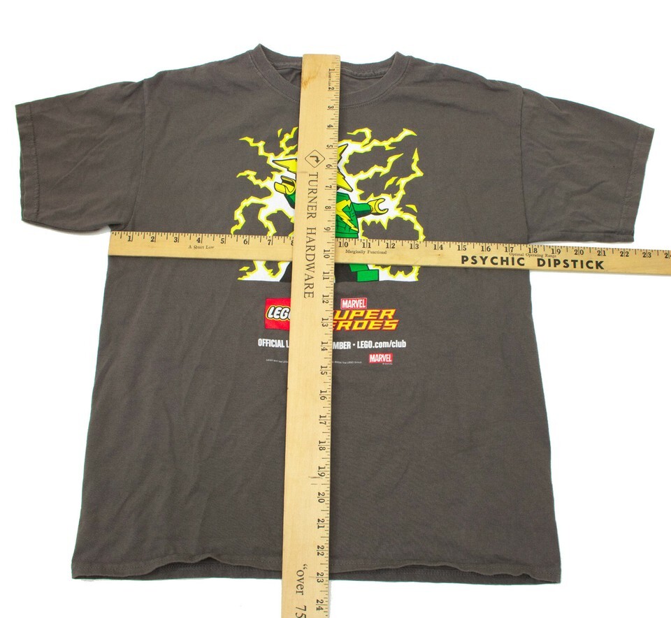 This is a previously owned very good Used Condition, Lego Marvel Super Heroes tee shirt There are some minimal signs of normal wear and slight fading. No rips, holes, stains, or tears. The graphic shows some minor flaking.