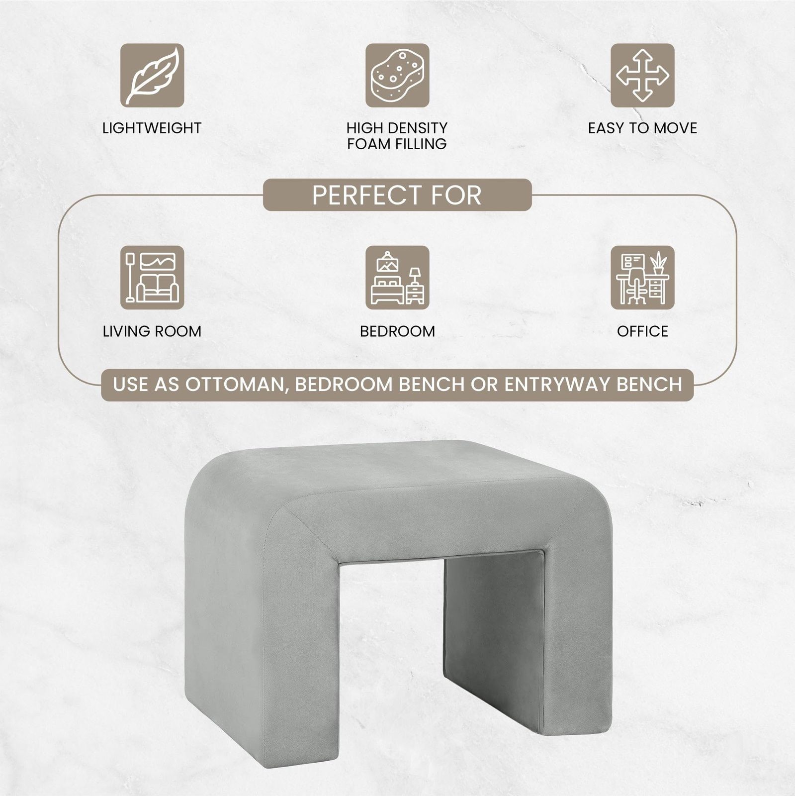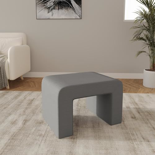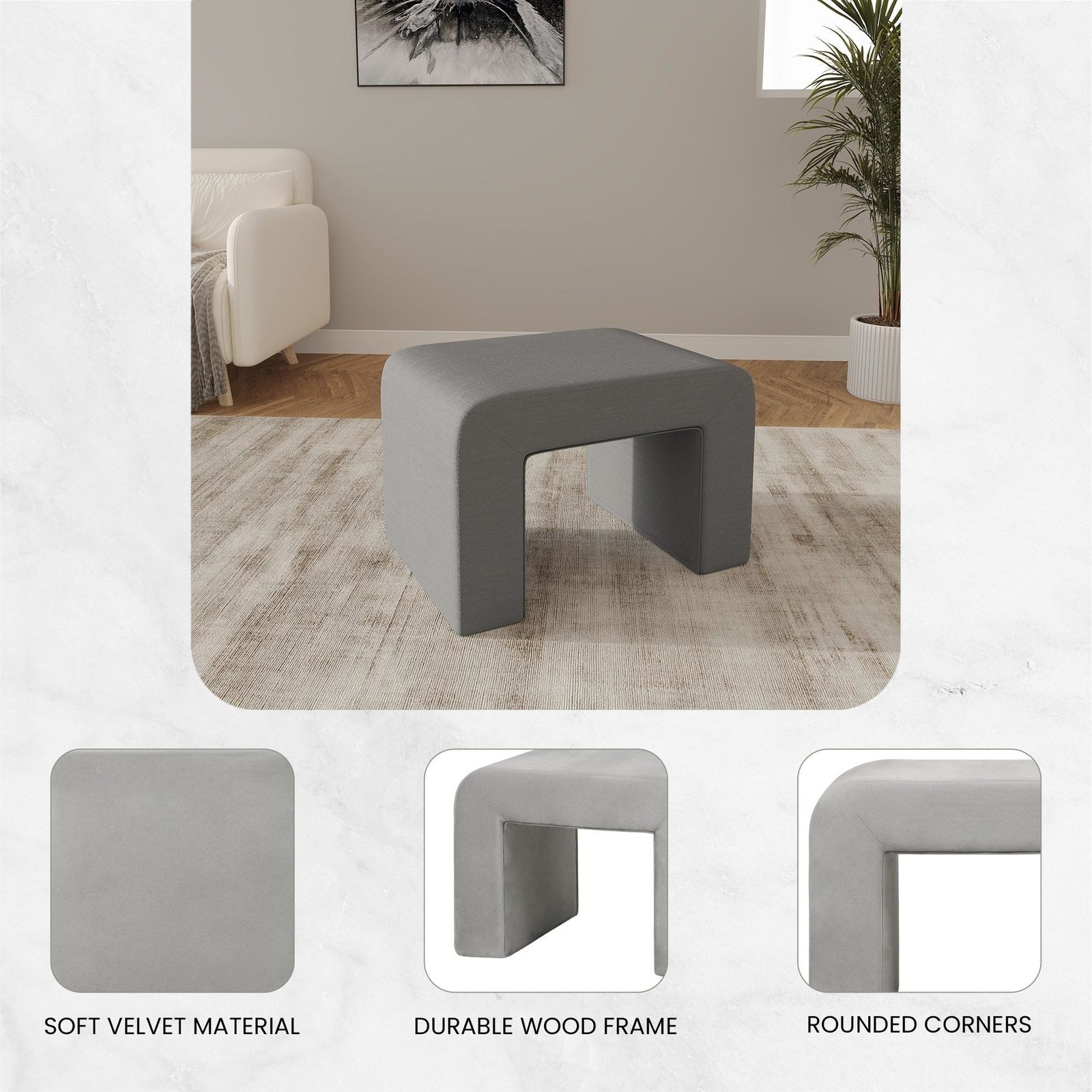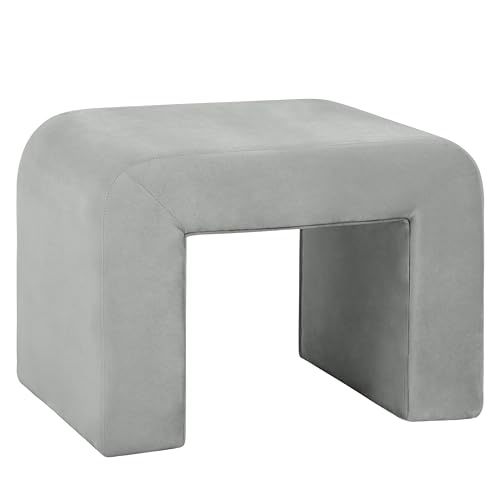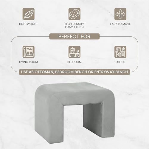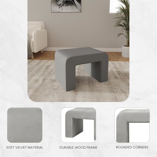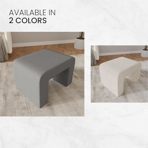 Bullet point: [CURVED WATERFALL DESIGN] The bench features a gracefully curved waterfall design and is fully covered in velvet or boucle fabric. Velvet fabric is known for its rich and smooth texture, and boucle fabric offers a unique, and textured surface. The waterfall edge, which runs along the sides of the bench, enhances the overall appearance, and provides a clean and refined finish.