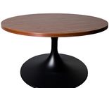 Bullet point: [CLEAN AND ELEGANT DESIGN] This coffee table showcases a simple, round shape that brings a clean and elegant touch to any room. The wooden top adds warmth and texture, creating a natural balance with the black tulip pedestal base. The tulip base is designed to provide solid support, giving the table a sleek and modern appearance. Its minimalist design blends effortlessly with a variety of decor styles, making it a versatile and stylish addition to any space.