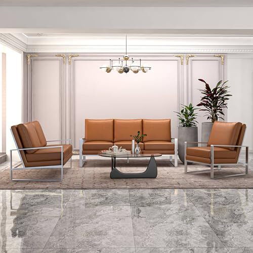 - LeisureMod 3-Piece Sofa Set Upholstered in Leather Accent Chair with Brushed Sta
