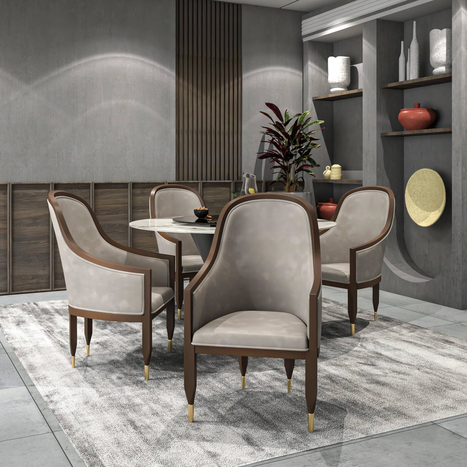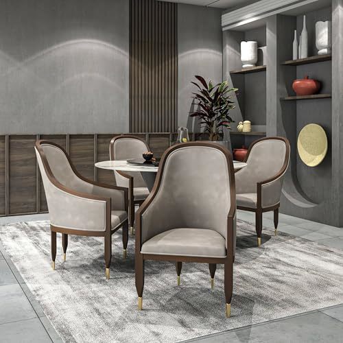 Bullet point: [DESIGN] Discover unmatched elegance with our modern dining chair, featuring luxurious cushioned leather seats filled with sponge and a curved back for optimal comfort during dining and relaxation. The sleek design includes stylish arms, adding both sophistication and extra support, enhancing the charm and functionality of any space.