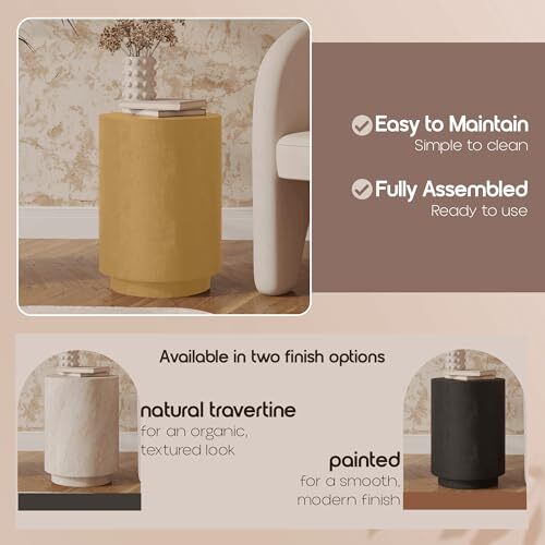 Bullet point: ?? MINIMALIST DESIGN: The side table features a minimalist design with smooth, clean lines, and a cylindrical shape. Its slimmer, tapered base enhances the overall sleek appearance, giving it a modern and sophisticated look. The table?s well-proportioned structure creates a stable foundation that complements contemporary and minimalist interiors.