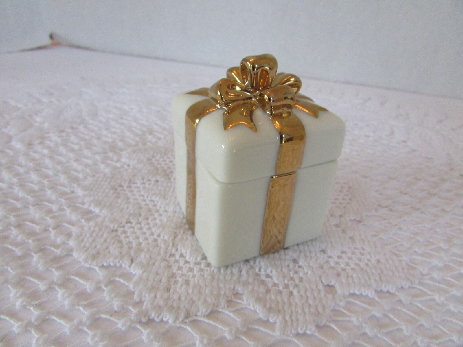 - Lenox Bone China Gift Trinket Box Gold Ribbon Bow Ivory Gold 2.5"