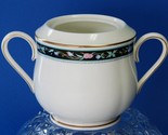 Lenox Carmella sugar bowl in excellent, pre-owned condition, but missing its lid. This china is from the Debut Collection. It is made of white bone china with a black band containing flowers and with a gold rim.