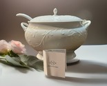 The Lenox Opal Innocence Carved Tureen Ladle is a luxurious and elegant piece of dinnerware, perfect for serving meals in style. Made of high-quality porcelain, this toleware set features a beautiful white color and intricate carved details. The tureen measures 12 inches in length and 8.5 inches in width/height, making it a large and impressive addition to any kitchen or dining room. This collectible set is sure to be a treasured part of any dinnerware collection. outer box has wear from storage/age