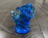 The product is a figurine made of blue glass depicting a cowboy hat with a bluebird on it, signed by artist Leo Ward in 2004. It is a unique and collectible piece from Terra Studios, known for their art glass creations. The design reflects a theme of happiness and is sure to add a touch of whimsy to any decor.