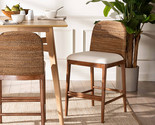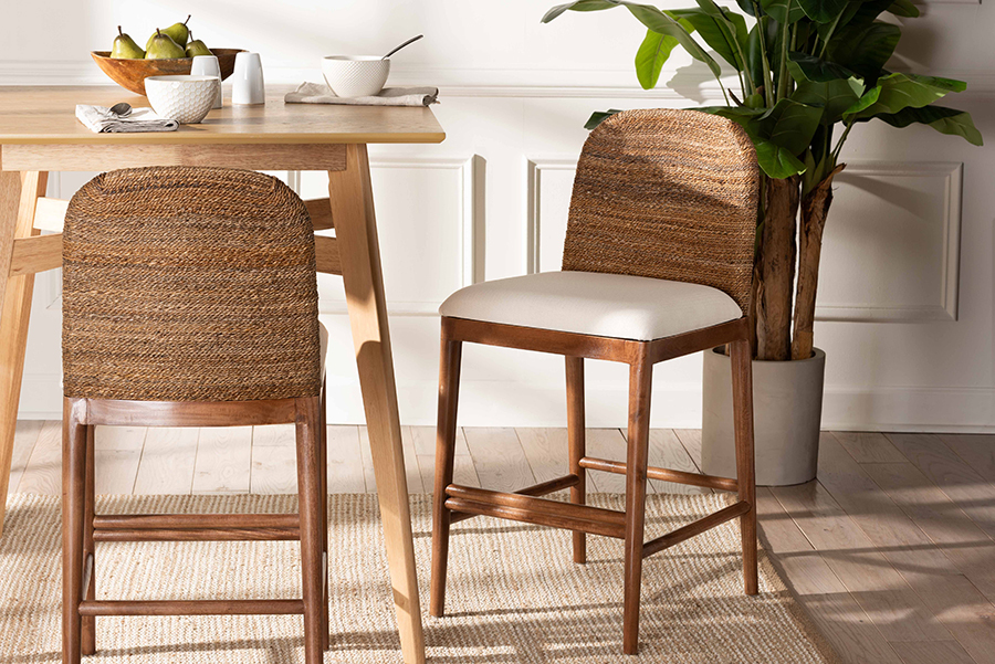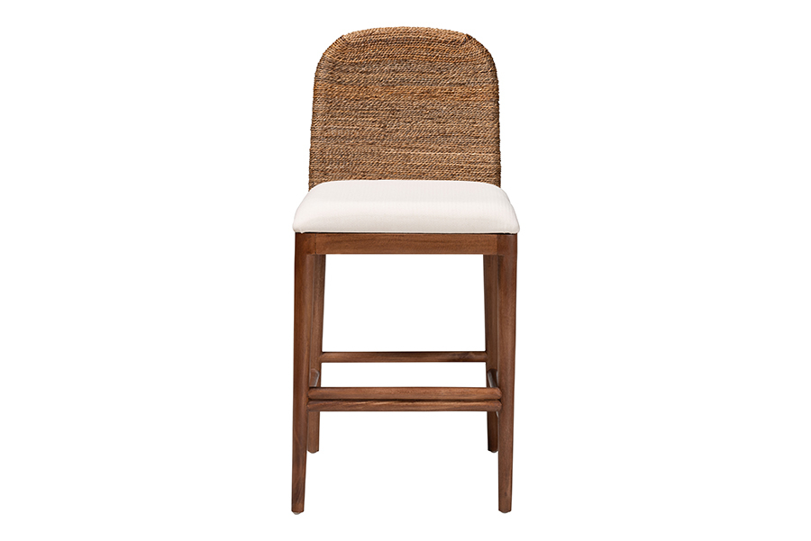 Features: Constructed from rubberwood, MDF wood, and LVL Walnut brown finish Ergonomic footrest Padded with foam and upholstered in fabric Woven seagrass embellishments Tapered legs Set Includes: One (1) Counter Stool
