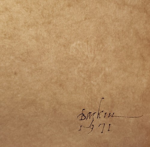 Baskin was distressed at the state of the art world when he made the drawings which were published in this portfolio. He said, ?The art of our time is an act of cowardice, a triumph of the trivial, a squandering of treasure.? In Baskin?s view, art was meant to be a means whereby ?man must rediscover man, harried and brutalized, distended and eviscerated, but noble withal, rich in intention, puissant in creative spur, and enduring in the posture of love.
