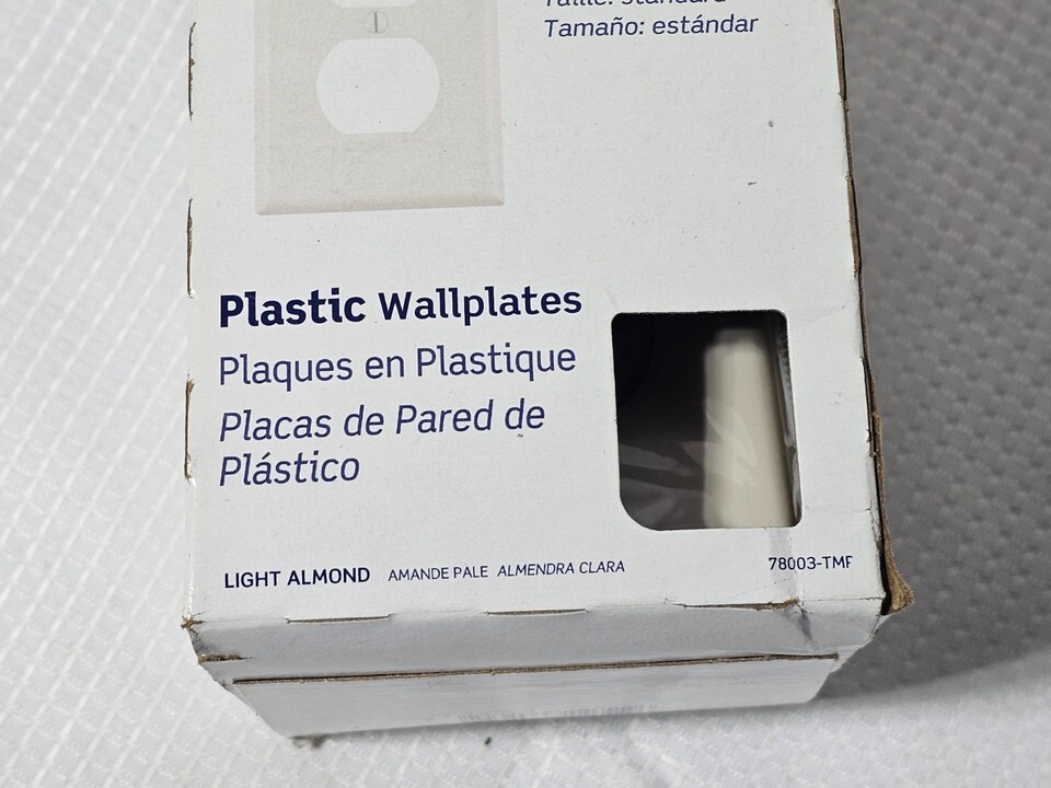 Description of item: Brand new and unused, this Leviton 78003-TMP 10-Pack Light Almond Plastic Wallplate Set offers a clean, durable finish for standard electrical outlets. Each wallplate is crafted from high-quality thermoplastic for long-lasting performance and resistance to fading, discoloration, or cracking. The light almond color provides a neutral, modern look that complements any room decor. Designed for standard duplex outlets, these wallplates are easy to install and perfect for both residential and commercial applications. The box shows minor cosmetic wear from storage but remains factory sealed with all 10 wallplates inside.