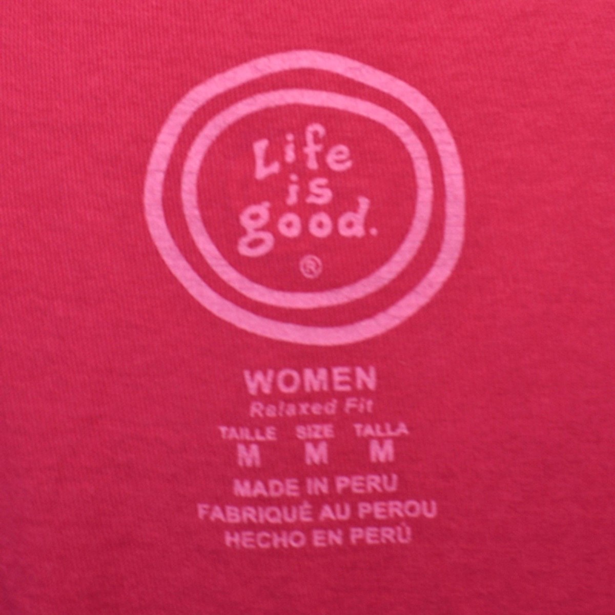 Life is Good women's size medium short sleeve t-shirt is in excellent condition. Soft fuchsia shirt has Life is Good logo with relaxing girl in lawn chair with drink in hand. 100% Cotton; Machine Wash