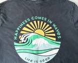 Life is Good men's size XL t-shirt. Black crew neck shirt reads Happiness Comes in Waves on the center back. Front left chest has the Life is Good logo and the left sleeve reads LIFE IS GOOD. Excellent condition with normal wear as shown in photos. 100% Cotton; Machine Wash.