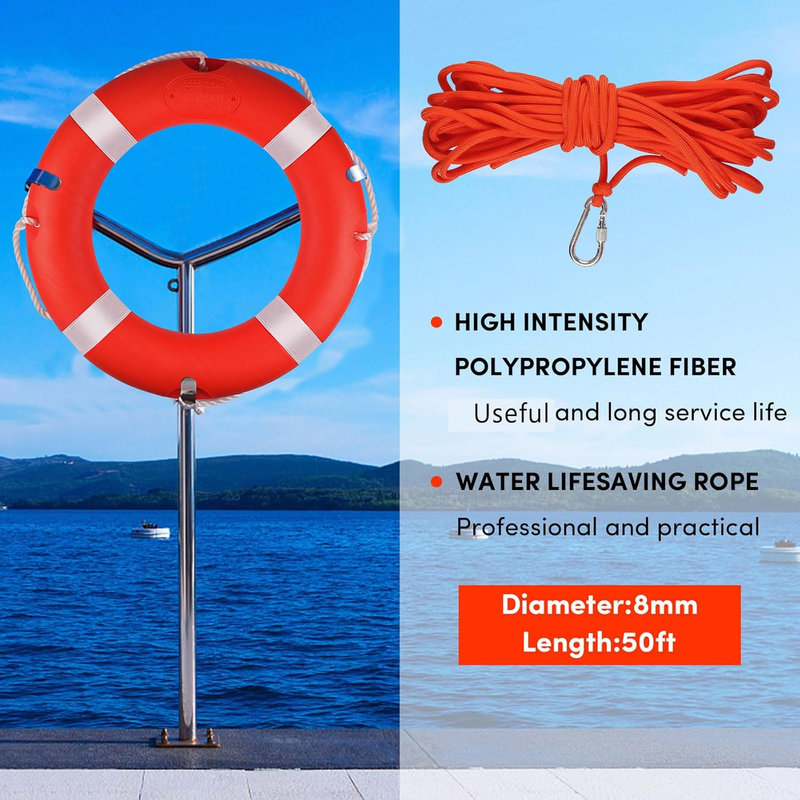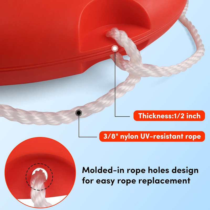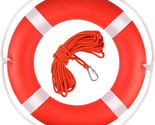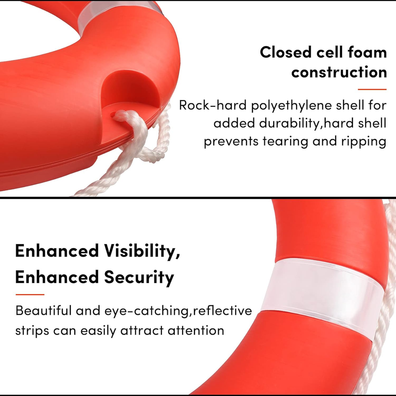 PROFESSIONAL AND PRACTICAL:23? life ring pool safety ring with white nylon rope makes boat throw rings easier to grip in the water, it can also be moved easily and quickly hung anywhere.molded core design allows for easy rope replacement.In addition,life preserver ring for boat equip with water floating lifesaving rope 50ft,convenient and practical.Life ring rope is tightly woven and brightly colored, which is very convenient and safe to use