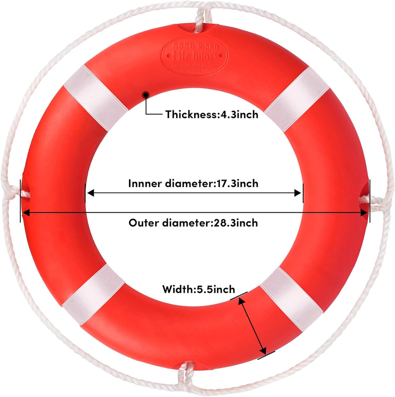 PRODUCT SIZE: 23inch life ring buoy outer diameter is 23 inches, inner diameter is 13.7 inches. Life preserver ring for boat width is 4 inches, thickness is 3.5 inches. Life preserver ring is available in 23 inch and 28 inch sizes.