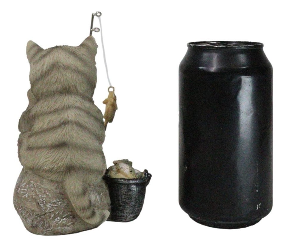 - Lifelike Grey Tabby Cat Sitting by Pail of Fishes And Pole Fishing Figurine