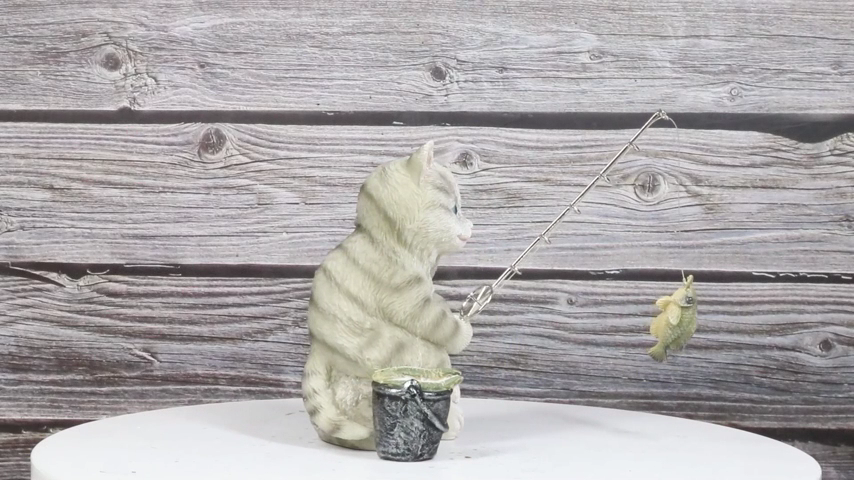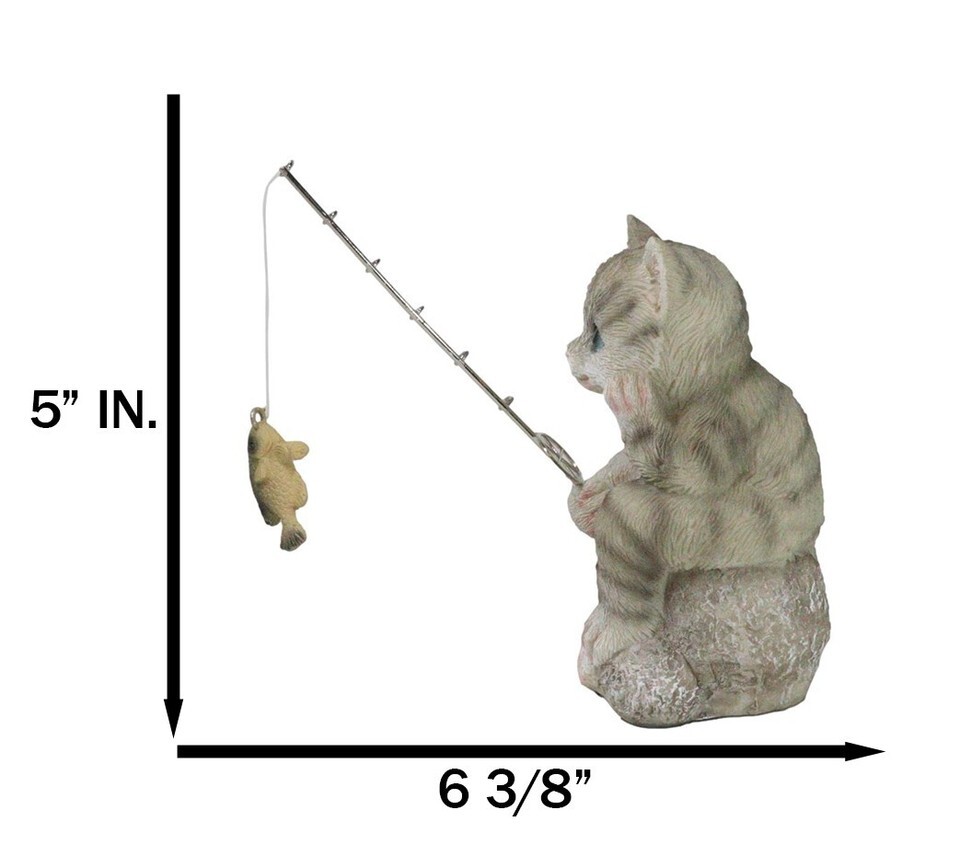 ? Add a touch of charm and whimsy to your space with our Lifelike Grey Tabby Cat Figurine. This delightful piece depicts a realistic grey tabby cat sitting contentedly by a pail of fish, with a fishing pole in paw and a hooked fish dangling temptingly. The intricate details and lifelike features make this figurine a captivating addition to any collection or decor. Perfect for cat lovers and those who appreciate a bit of playful storytelling in their home accents.