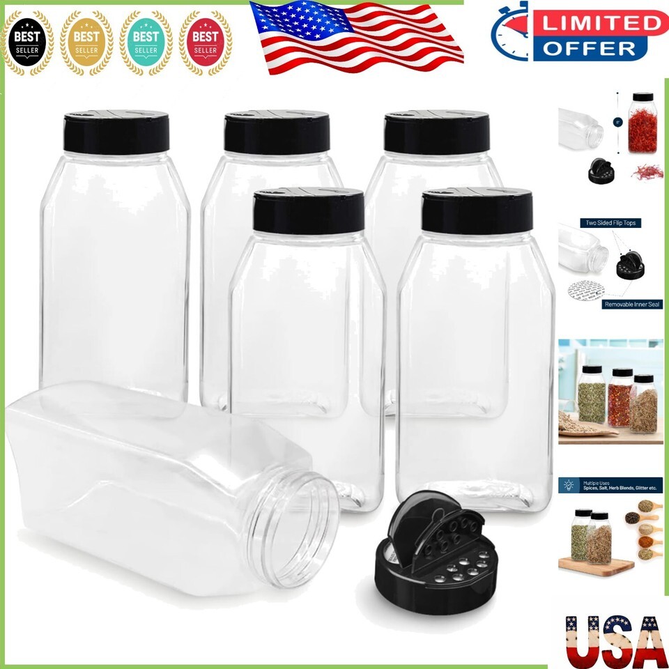 Includes 6 pieces of 32 Oz safe plastic spice jars, complete with black screw lids, suitable for your everyday needs.