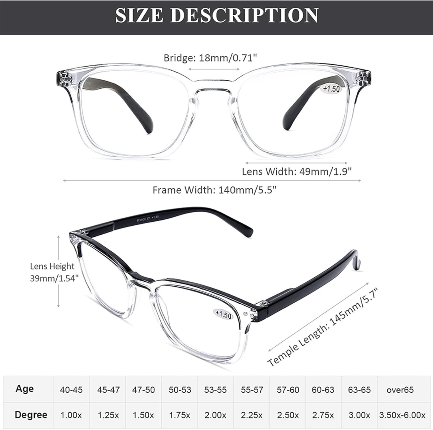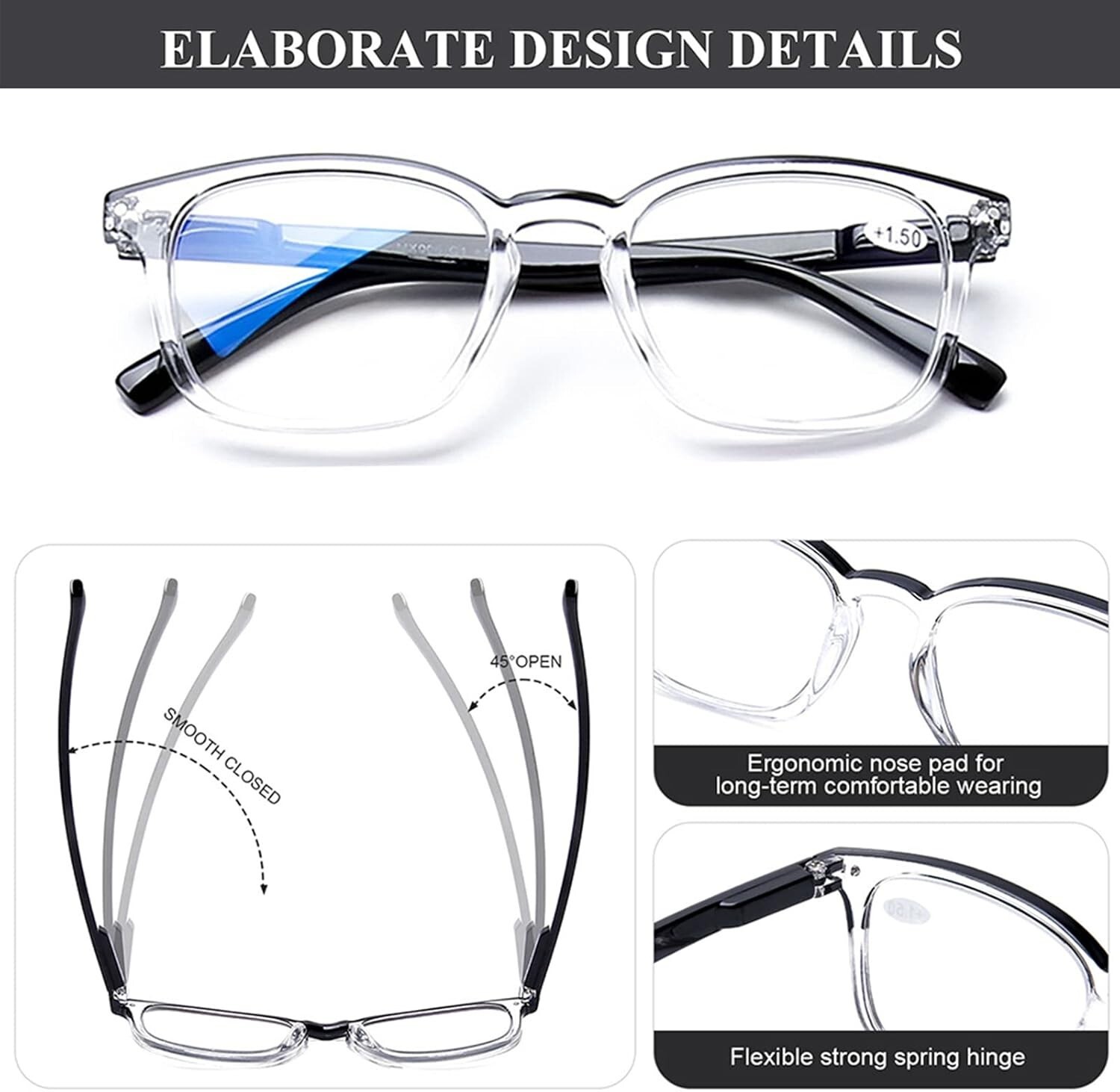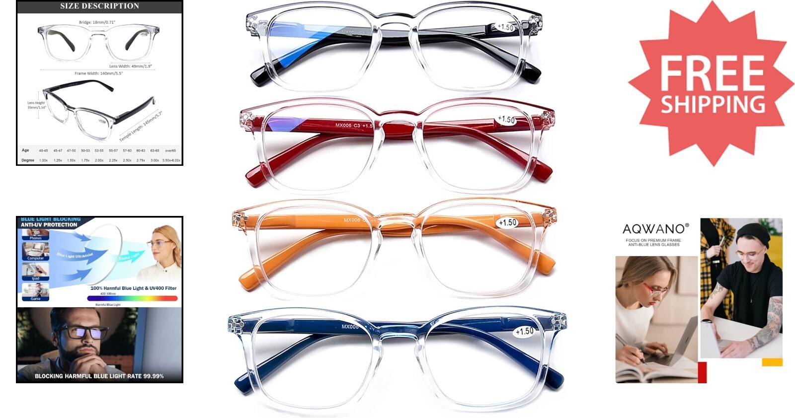 Experience durability and style with AQWANO's reading glasses. Crafted from ultra-durable materials, these glasses are designed for everyday use?from home to office?without compromising on comfort or elegance. Equipped with professional blue light protection, they effectively reduce eye strain and glare caused by screens, making them ideal for both men and women. The stylish clear design features spring hinges for a comfortable fit and a vibrant, modern look. Each pack includes four pairs, microfiber pouches, cleaning cloths, and a glasses box, making it a practical gift or personal staple. Quality is our priority, supported by a 90-day .