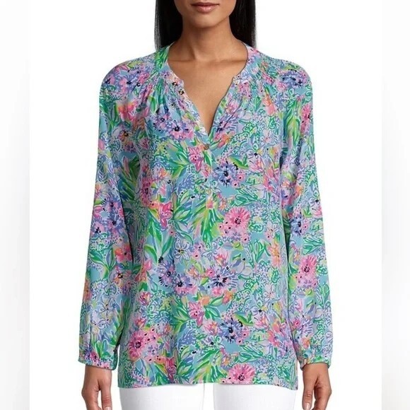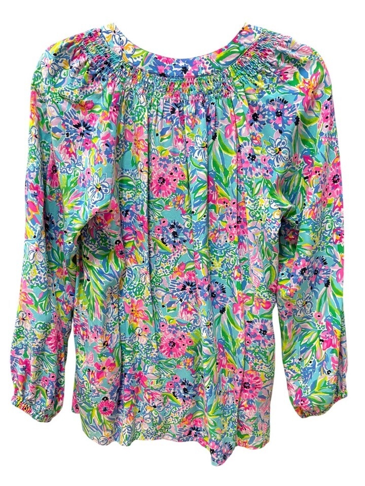 - Lilly Pulitzer Elsa Alligator Isle Amalfi Blue Floral Print 100% Silk Blouse L