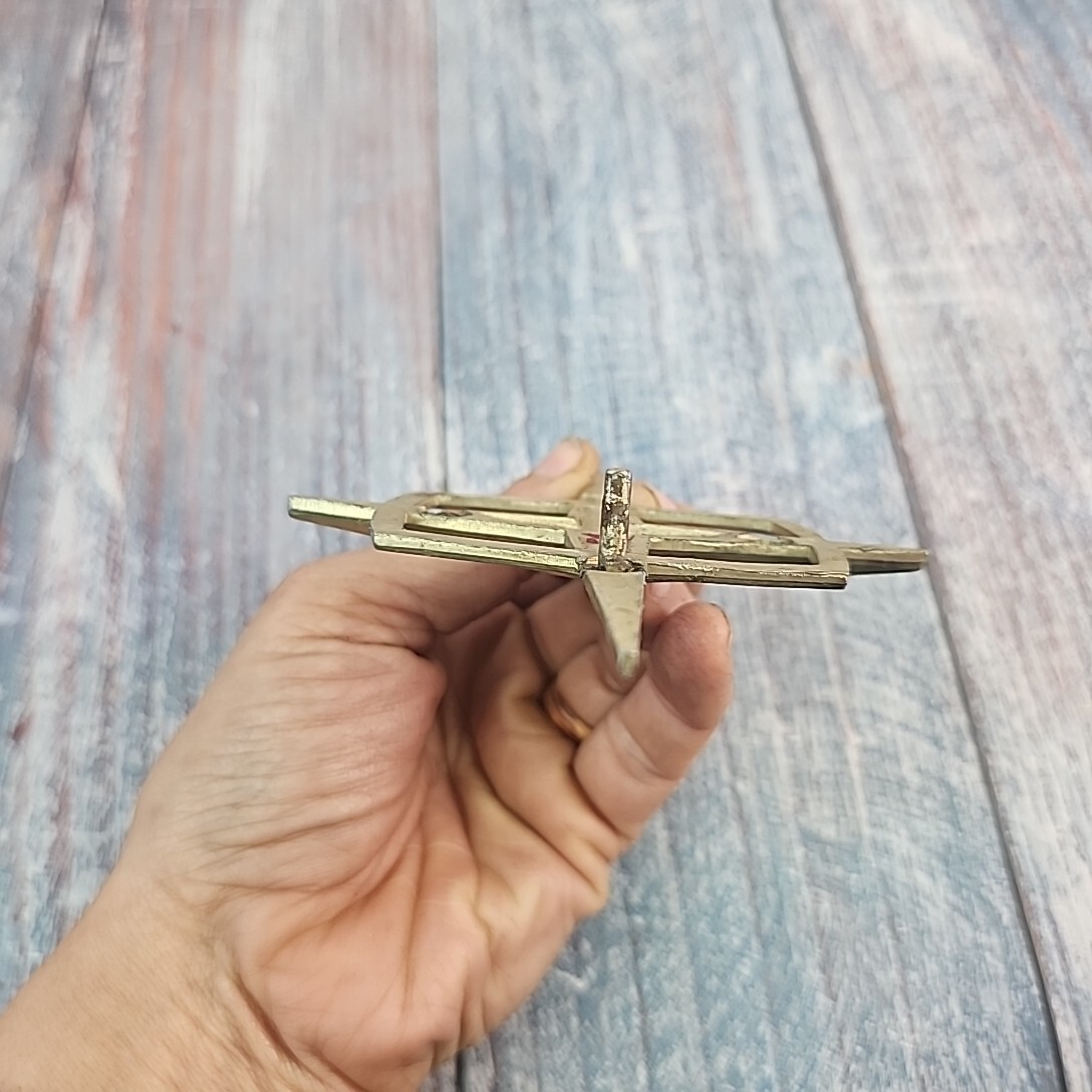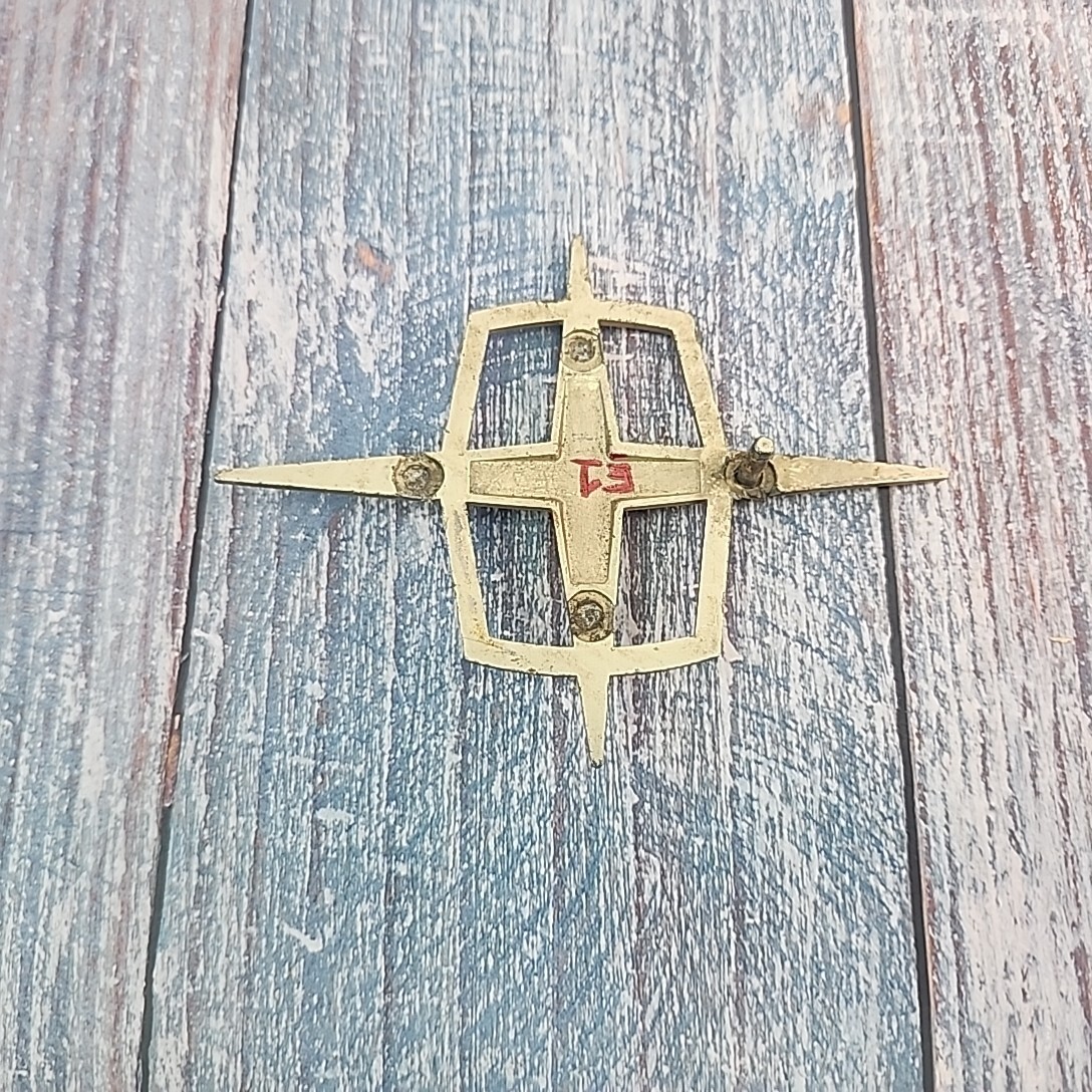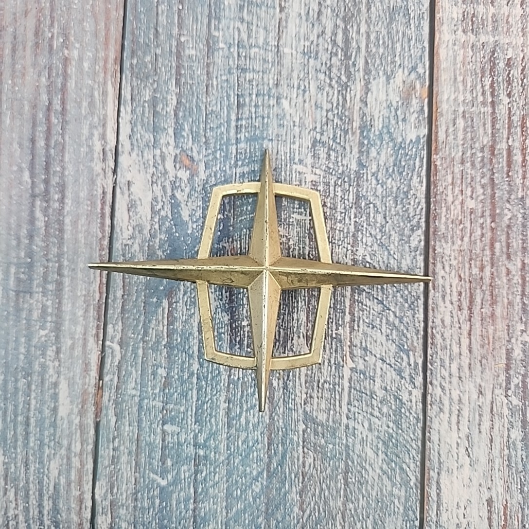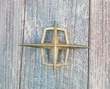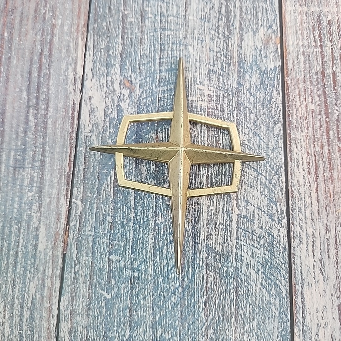 The Lincoln BAK6820980A 1958-1960 Golden Roof Sail Panel Exterior Emblem is a vintage metal ornament designed to be placed on the side of a car. This emblem features a star design, which is a theme emblematic of the Lincoln brand. The golden color and metallic finish give it a luxurious and classic look, perfect for repairing or restoring a vintage car. Made in the United States, this emblem is approximately 4.5 inches in length and 3.5 inches in width, making it suitable for a Lincoln car from 1958 to 1960.